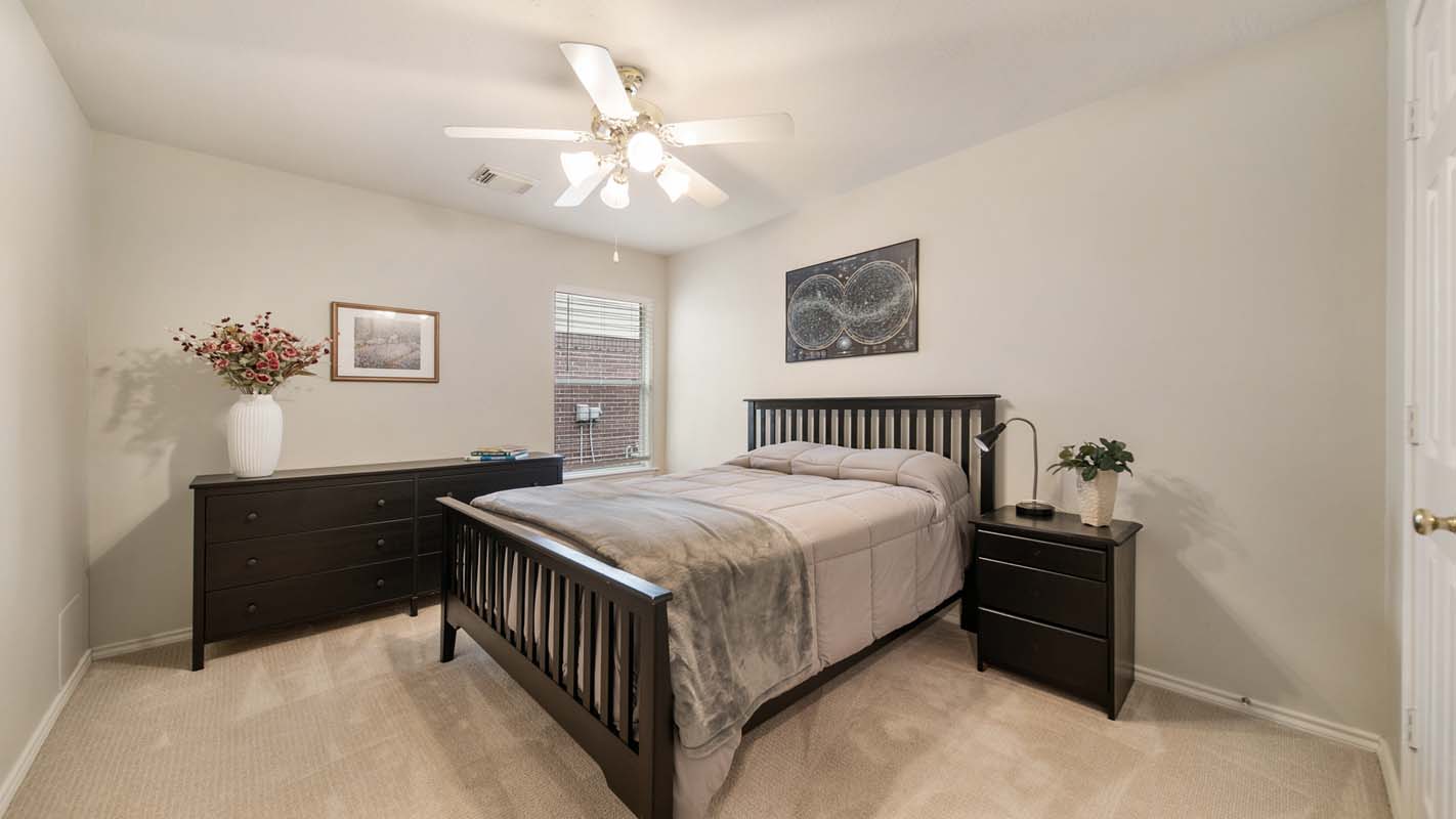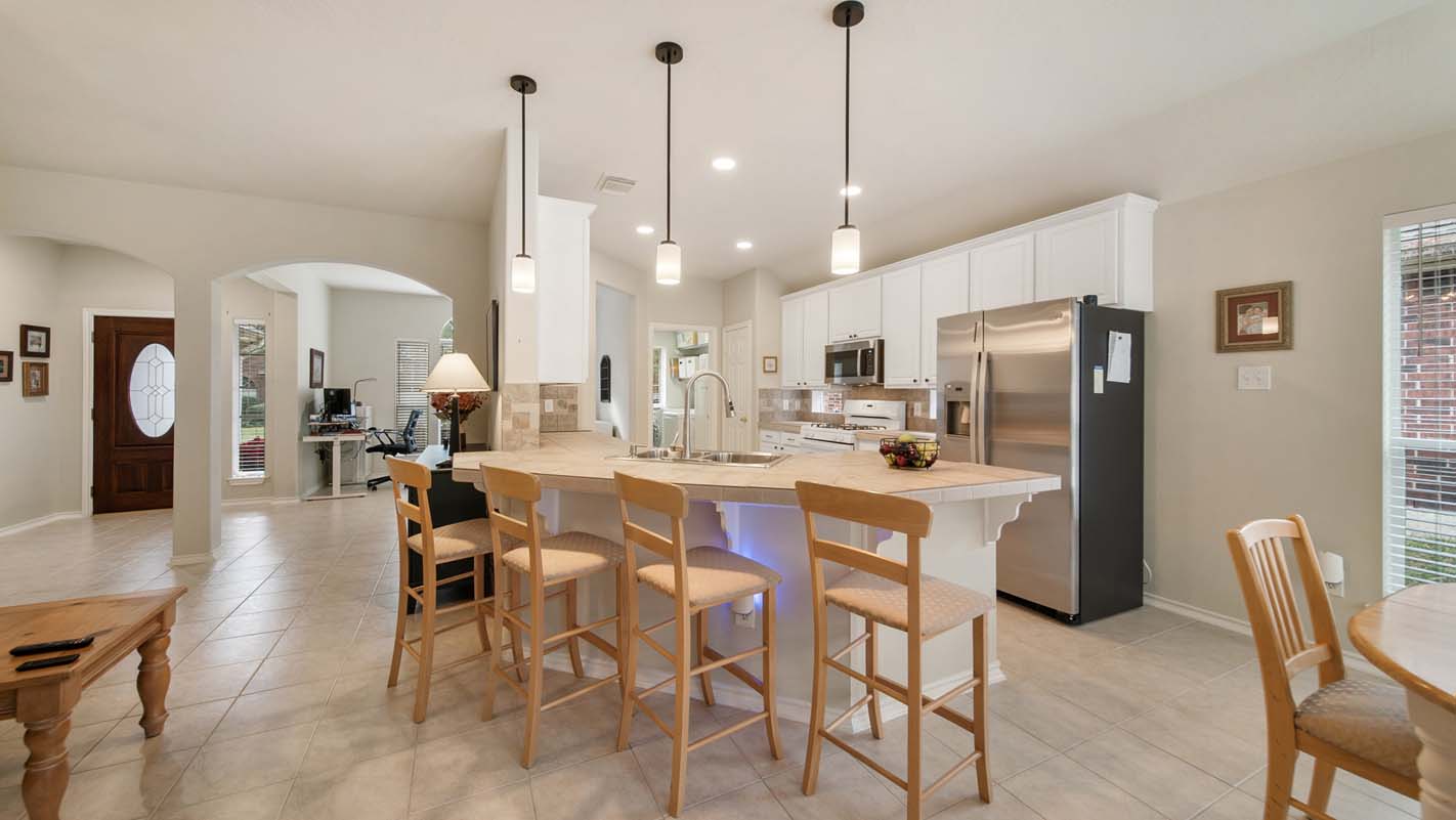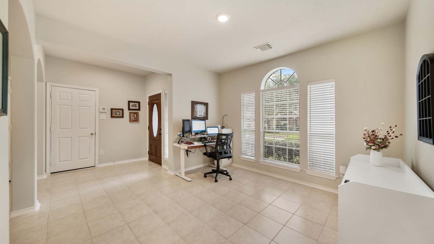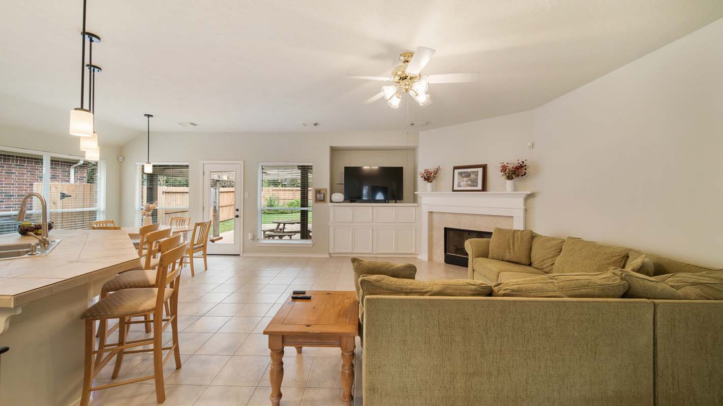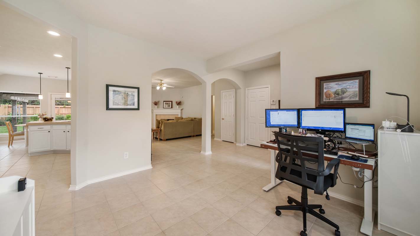 Immaculate 3-bedroom brick home in Alden Bridge! Off the entry, a versatile space is perfect for a formal dining or a study. The open-concept design includes a family room with fireplace and built-ins, plus a spacious kitchen offering gas range, ample cabinets, tile countertops, breakfast bar, and a bright breakfast area. The primary suite is a true haven, with a separate space perfect for a private study, craft space or sitting room; two walk-in closets, and an ensuite bath featuring a jetted tub and separate shower complete the space. Two additional bedrooms, with a shared full bath. Tile floors flow through the main living areas, with carpet in bedrooms. Enjoy a fully fenced private backyard, patio with arbor, and a 2-car garage. Excellent location near shopping, dining, entertainment, and easy freeway access.